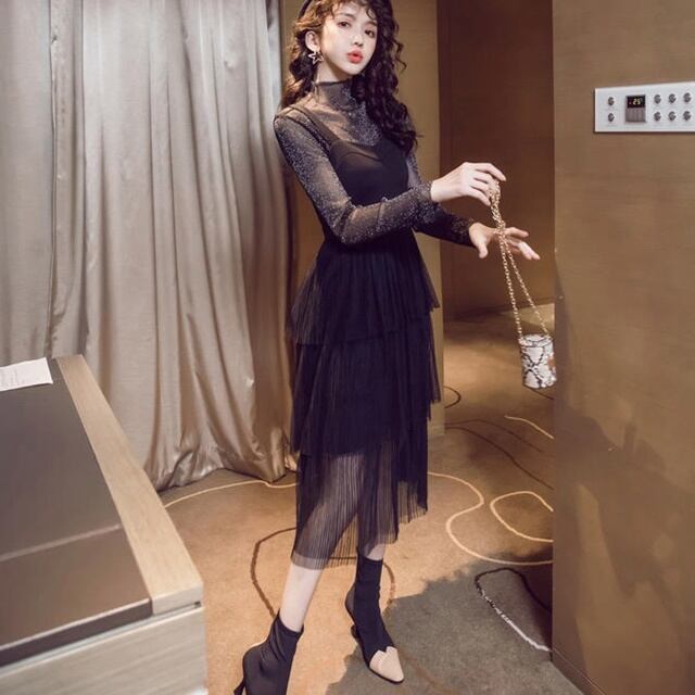 【送料無料】ワンピース 冬 長袖 きれいめ 大きいサイズ ティアード シースルー お呼ばれ コーデ 結婚式 二次会 20代 30代 40代 ブラック OP-501IU