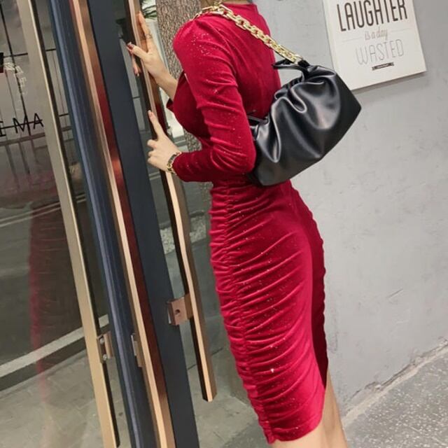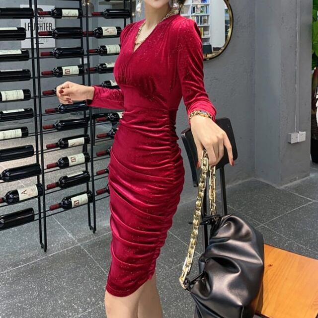 【送料無料】ワンピース 冬 長袖 きれいめ カシュクール Vネック ハイウエスト タイト ひざ丈 お呼ばれ フォーマル 結婚式 二次会 20代 30代 40代 レッド グリーン ブラック OP-505IU