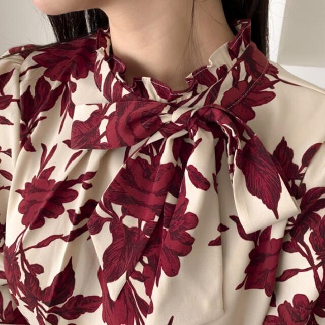 【送料無料】セットアップ 秋冬 ブラウス フォーマル ボウタイ 長袖 スカート ひざ丈 花柄 ハイウエスト お呼ばれ 結婚式 二次会 20代 30代 40代 ベージュ レッド OP-508IU