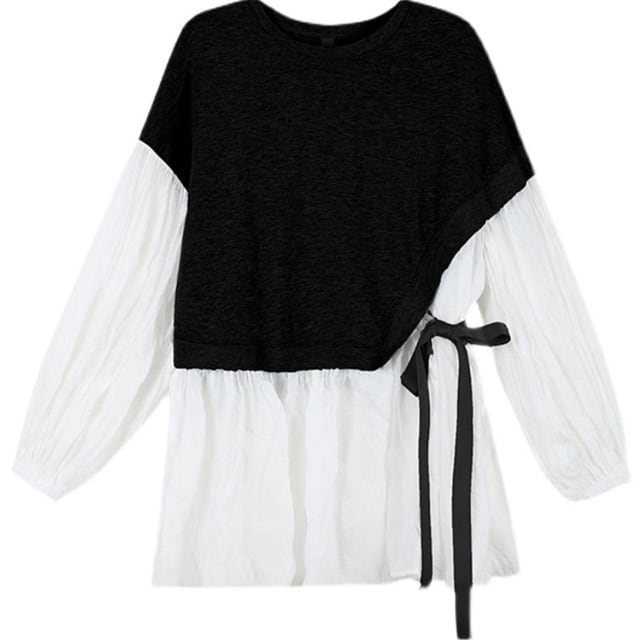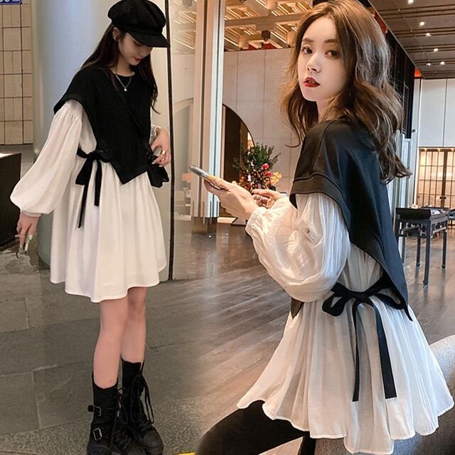 【送料無料】異素材トップス 異素材ニット 切り替え 長袖 重ね着風 カットソー ニットトップス レイヤード リボン カジュアル デート お出かけ 春 秋冬 20代 30代 40代 ブラック グレー TO-445IU