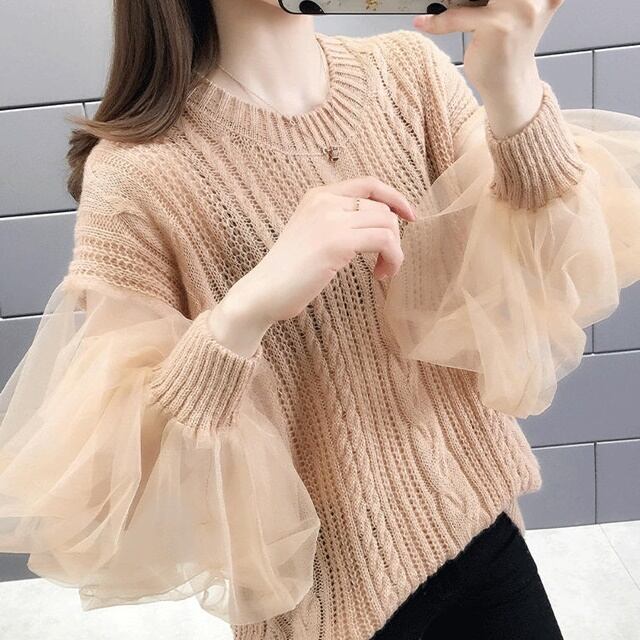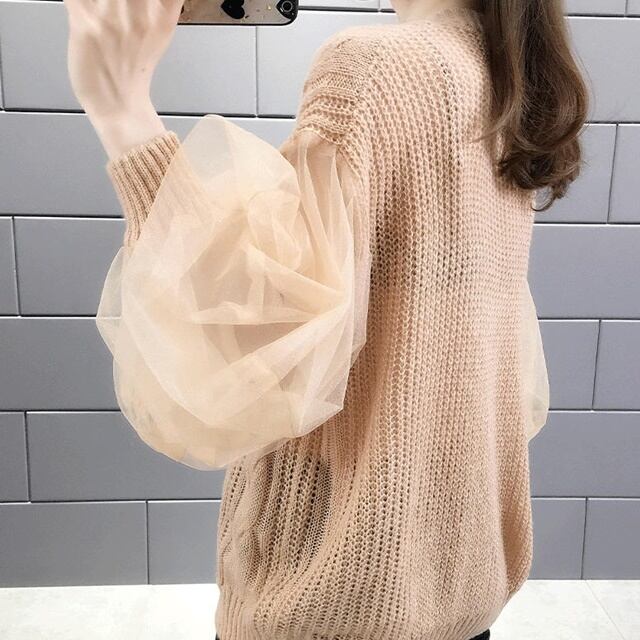薄手の半袖ニットにレースのボリューム袖を合わせた華やかな1枚♪