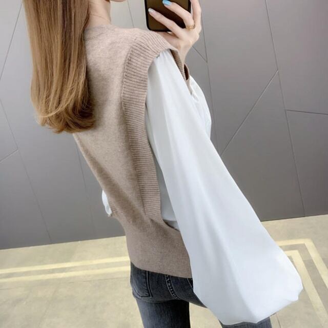 【送料無料】異素材トップス 異素材ニット 切り替え 長袖 重ね着風 カットソー ニットトップス レイヤード カジュアル デート お出かけ 通勤 春 秋冬 20代 30代 40代 グレー ベージュ ブラック TO-455IU