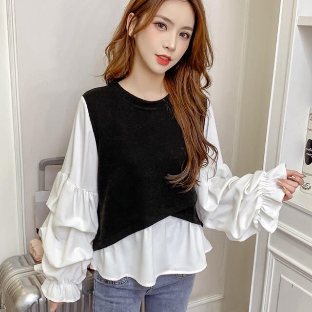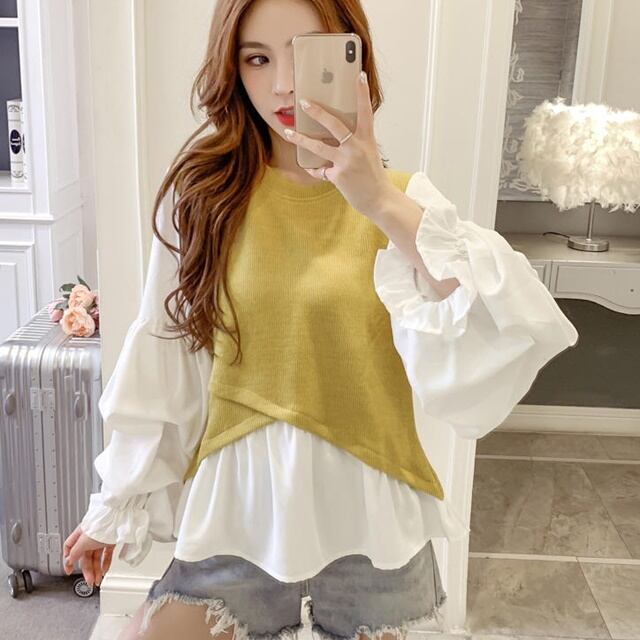 まるでニットとブラウスを重ね着したように見えるトップス♪