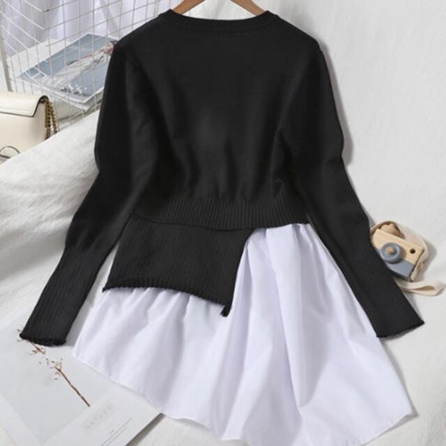 【送料無料】異素材トップス 異素材ニット ドルマンニット ドルマンスリーブ 切り替え 長袖 重ね着風 カットソー ニットトップス レイヤード カジュアル デート お出かけ 通勤 春 秋冬 20代 30代 40代 ブラック TO-462IU