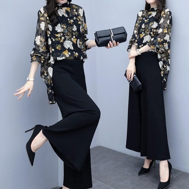 華やかな印象を与えてくれるトップスが花柄のセットアップスーツ♪