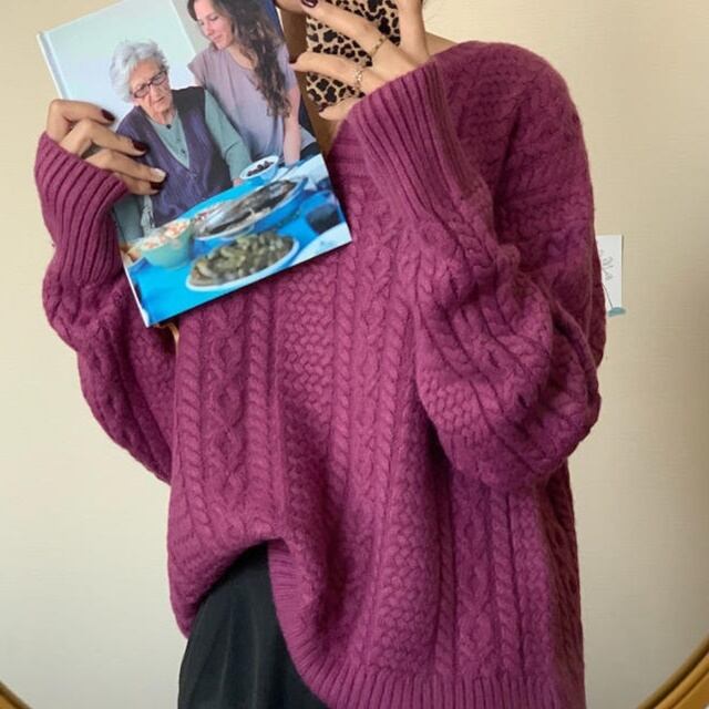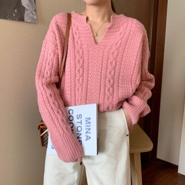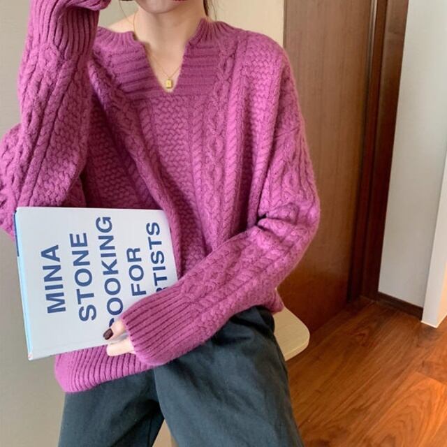 【送料無料】ニット レディース 冬 ケーブル編み キーネック 長袖 大人 きれいめ カジュアル シンプル ピンク ホワイト パープル 20代 30代 40代 BY-008
