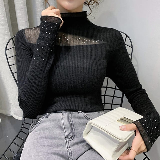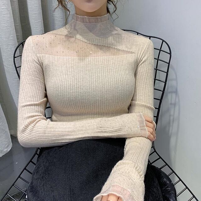 【送料無料】ニット レディース 秋冬 長袖 ハイネック シースルー 大人 細身 セクシー カジュアル 上品 ベージュ オフホワイト イエロー ブラック 30代 40代 BY-018