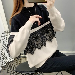 【送料無料】ニット レディース 秋冬 長袖 大きいサイズ レース バイカラー 大人 上品 きれいめ 20代 30代 40代 ベージュ ブラック BY-024