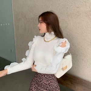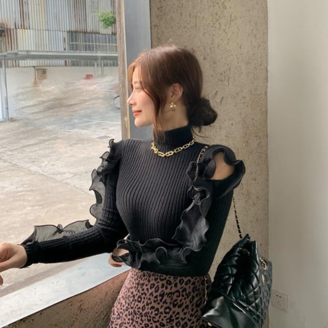 【送料無料】ニット レディース リブニット 生地 ハイネック 秋冬 長袖 フリル オープンショルダー きれいめ 上品 大人 肌見せ おしゃれ スリム 細身 カジュアル セクシー 20代 30代 40代 ホワイト ブラック BY-027