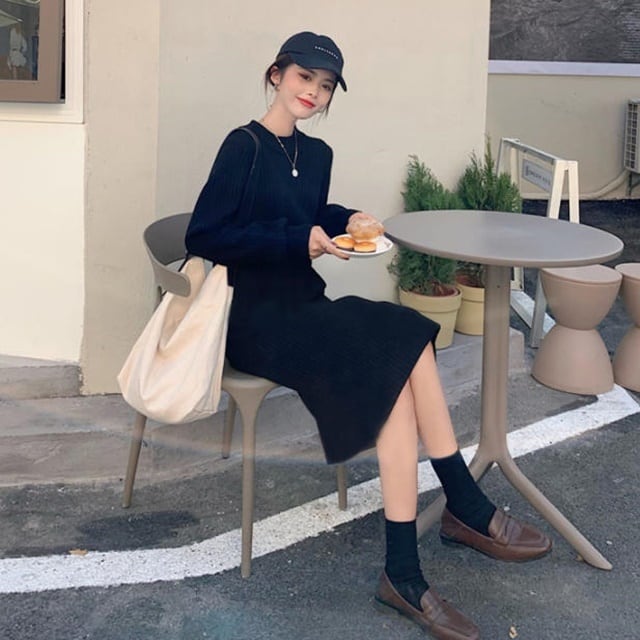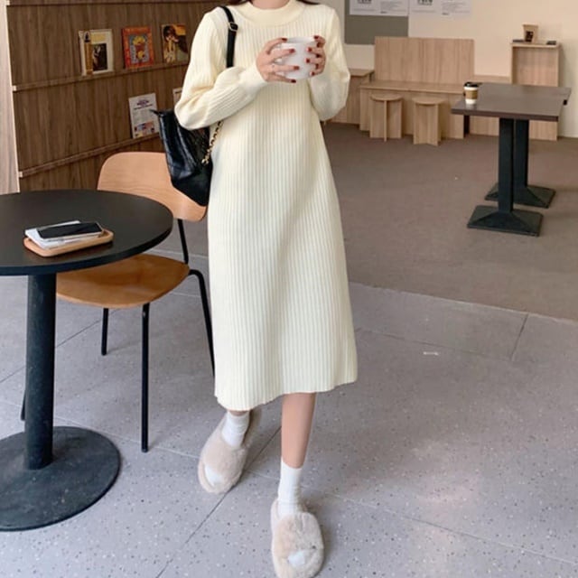 【送料無料】ニットワンピース ひざ丈 冬 大きいサイズ 40代 韓国 長袖 きれいめ 春 20代 30代 リブ ゆったり カジュアル ブラウン ホワイト ブルー ブラック BY-030