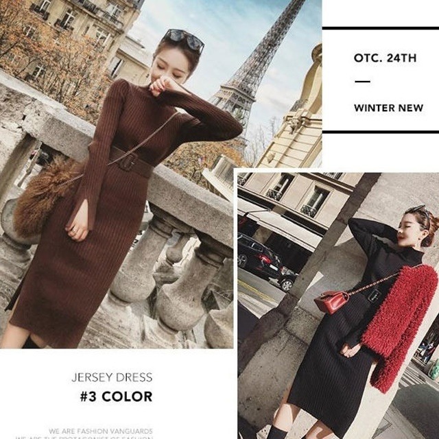 【送料無料】ニットワンピース ロング ミモレ丈 冬 40代 韓国 長袖 きれいめ 春 ハイネック リブ タイト ベルト付き 上品 大人 20代 30代 イエロー ブラウン ブラック BY-035