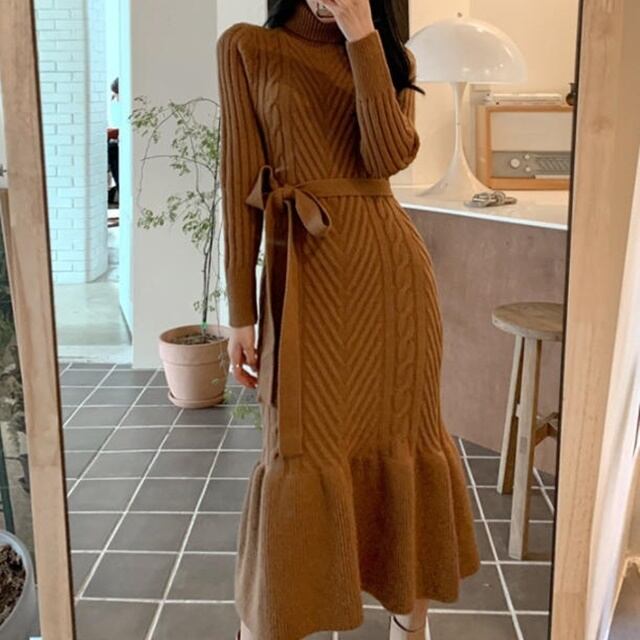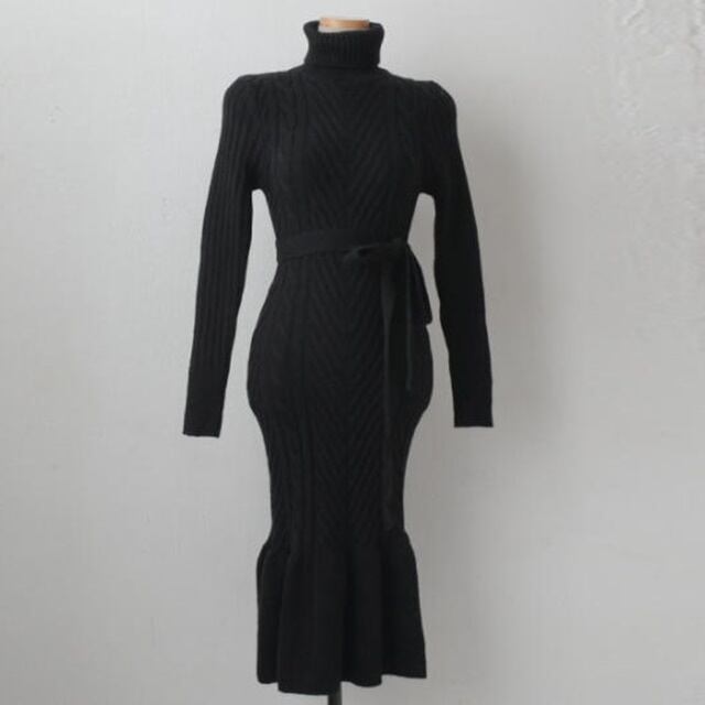 【送料無料】ニットワンピース ロング 冬 40代 韓国 長袖 きれいめ 春 タートルネック ケーブル編み ウエストリボン フレア 20代 30代 ブラウン ブラック BY-040