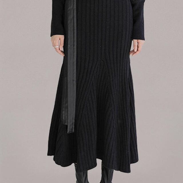 【送料無料】ニットワンピース ロング 冬 40代 韓国 長袖 きれいめ 春 ハイネック マーメイド ベルト付き 20代 30代 ブラック BY-042