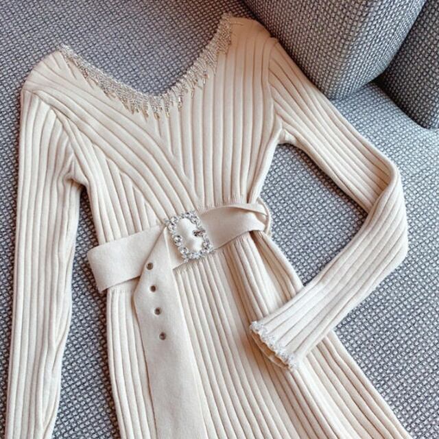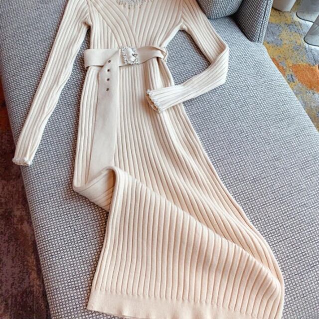 【送料無料】ニットワンピース ロング ミモレ丈 冬 40代 韓国 長袖 きれいめ 春 タイト ベルト付き ビジュー 20代 30代 ベージュ BY-045