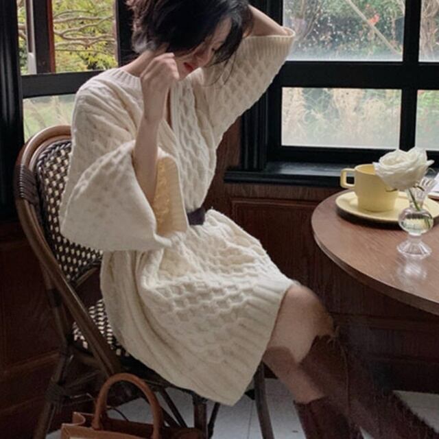 【送料無料】ニットワンピース ひざ丈 冬 大きいサイズ 40代 韓国 長袖 きれいめ 春 Vネック ケーブル編み ワイドスリーブ カジュアル ゆったり 20代 30代 ホワイト ブラック BY-051