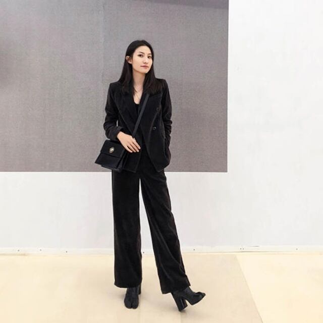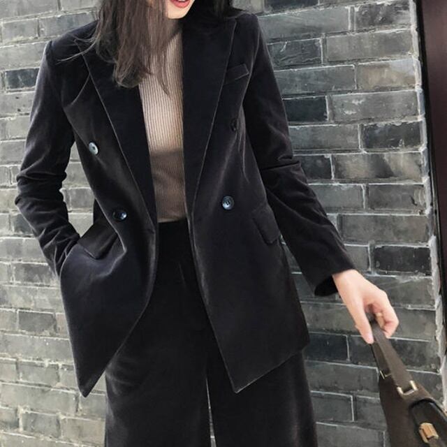 【送料無料】セットアップ レディース おしゃれ パンツスーツ 卒園式 大きいサイズ 卒業式 長袖 ジャケット ワイドパンツ きれいめ 光沢 ベロア ハイウエスト フォーマル お呼ばれ 同窓会 大人 上品 20代 30代 40代 ブラック BY-098