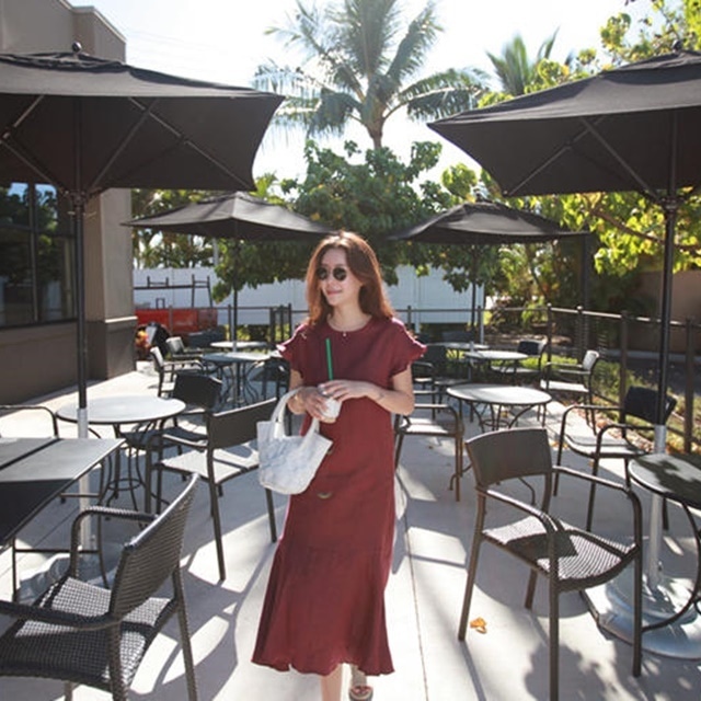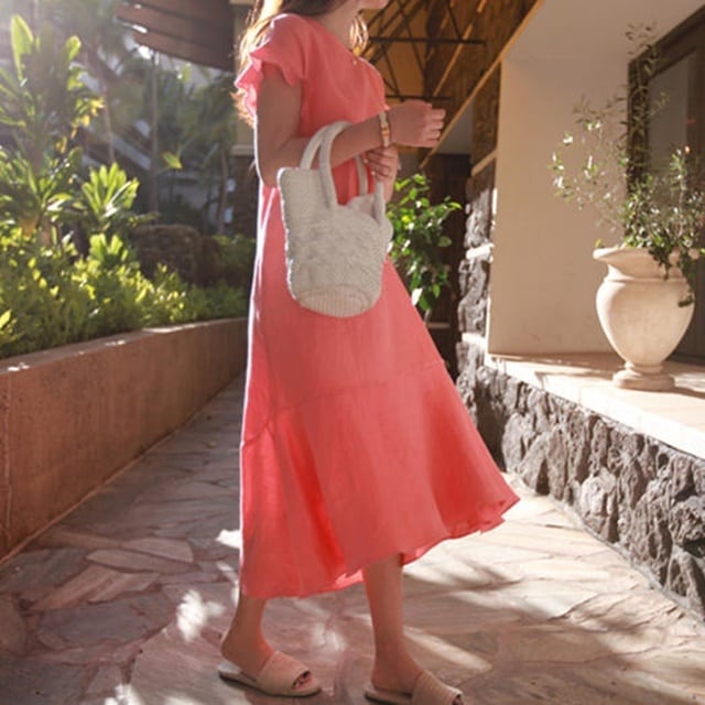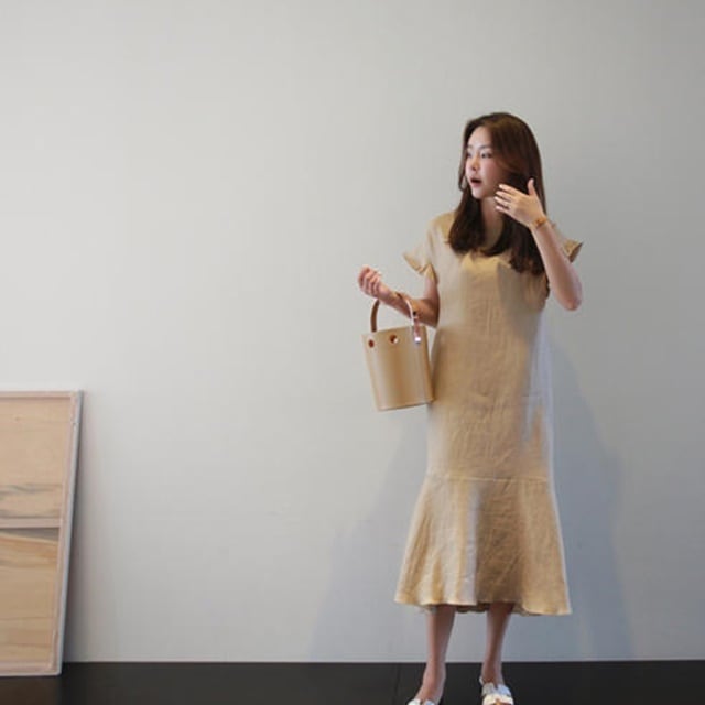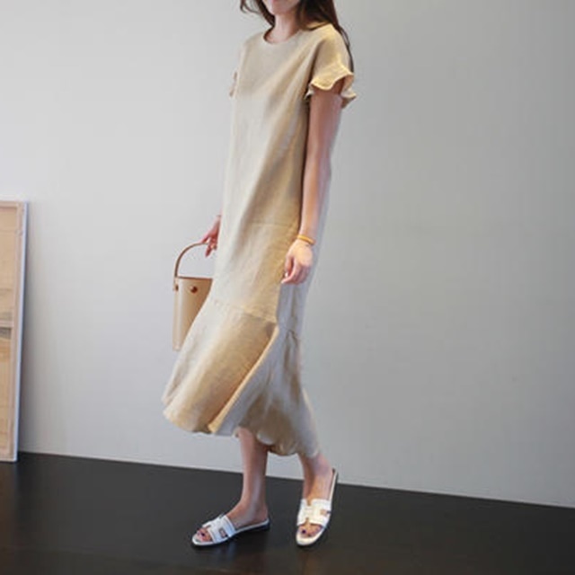 【送料無料】リネン ワンピース ナチュラル 秋冬 半袖 マーメイド フレア 30代 40代 50代 シンプル カジュアル 大人 無地 ベージュ ピンク レッド BY-114