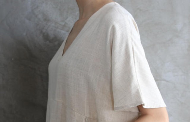 【送料無料】リネン ワンピース ナチュラル 秋冬 半袖 Vネック フレア 30代 40代 50代 シンプル カジュアル 大人 無地 ベーシック 上品 ホワイト BY-115