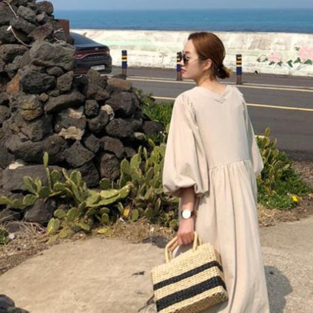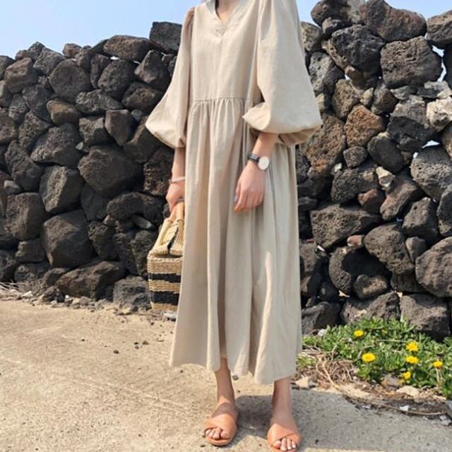 【送料無料】リネン ワンピース ナチュラル 秋 春 半袖 パフスリーブ 30代 40代 50代 シンプル カジュアル 大人 無地 ベーシック ネイビー ベージュ BY-120