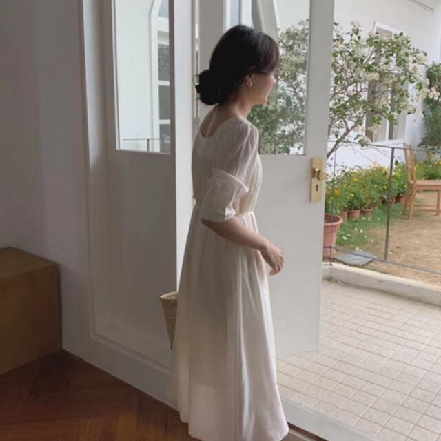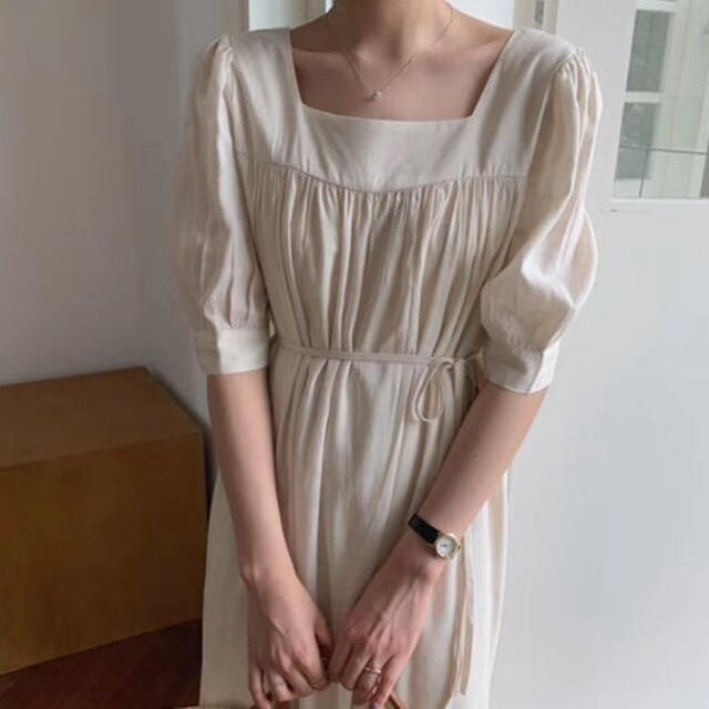 【送料無料】リネン ワンピース ナチュラル 秋 春 半袖 スクエアネック 30代 40代 50代 シンプル カジュアル 大人 無地 ベーシック ベージュ ホワイト BY-121