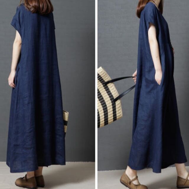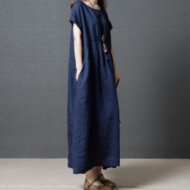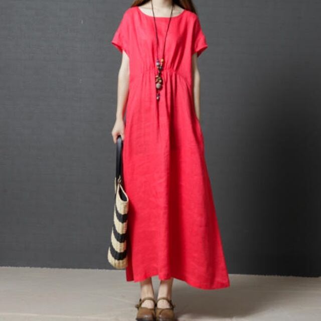 【送料無料】リネン ワンピース ナチュラル 秋 春 半袖 フレア 30代 40代 50代 シンプル カジュアル 大人 無地 ベーシック ネイビー レッド BY-103