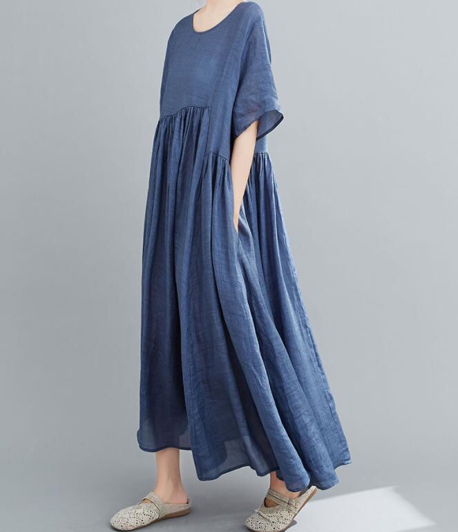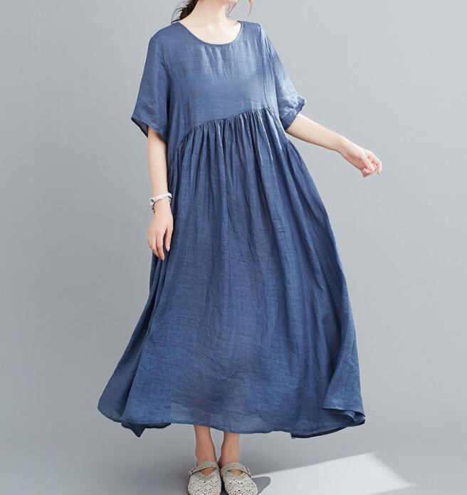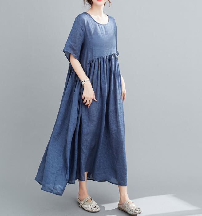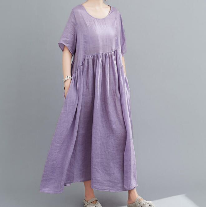 【送料無料】リネン ワンピース ナチュラル 秋 春 半袖 フレア 透け感 30代 40代 50代 シンプル カジュアル 大人 無地 ベーシック パープル ブルー BY-105