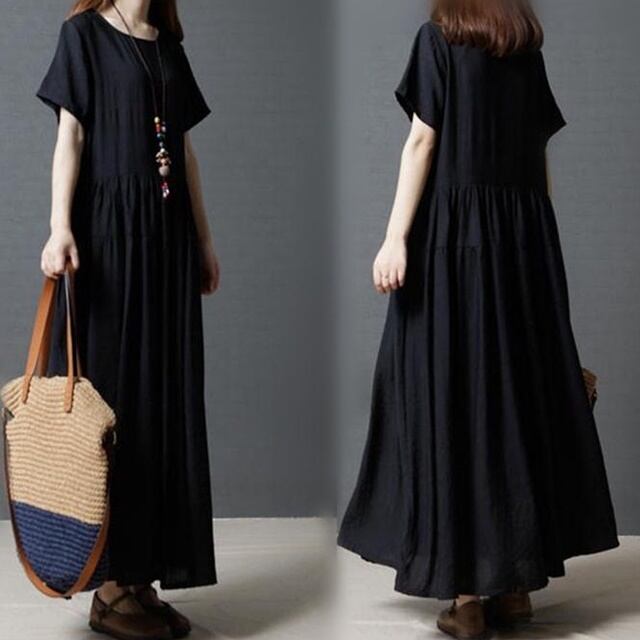 【送料無料】リネン ワンピース ナチュラル 秋 春 半袖 フレア 30代 40代 50代 シンプル カジュアル 大人 無地 ベーシック ブラック BY-109