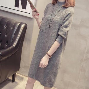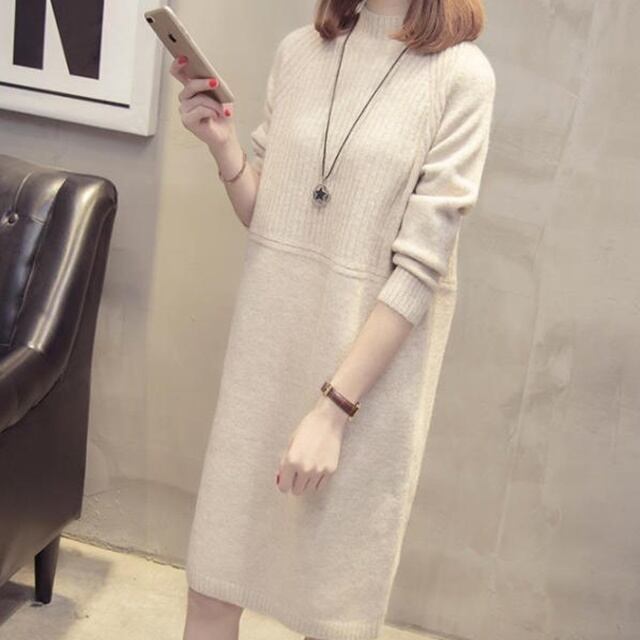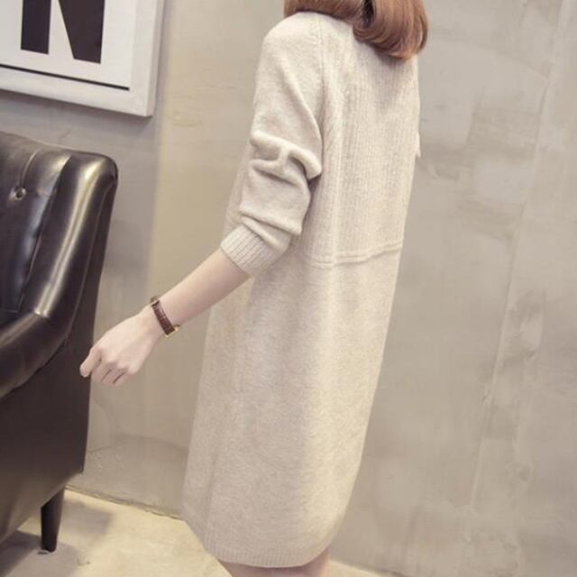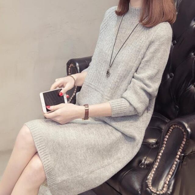 【送料無料】ニットワンピース 大きいサイズ 韓国 ひざ丈 長袖 無地 大人 シンプル カジュアル 30代 40代 40代 ライトグレー ベージュ グレー ブラック BY-129