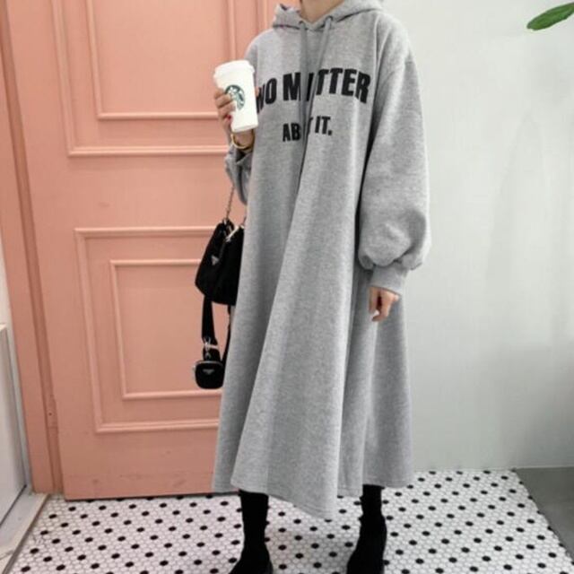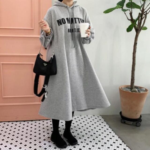 【送料無料】パーカーワンピース 長袖 春 ロゴ ゆったり オーバーサイズ フード付き 大人 カジュアル シンプル 20代 30代 40代 グレー ブラック BY-142