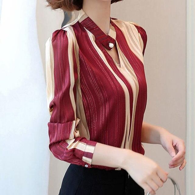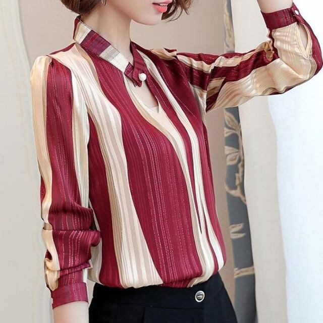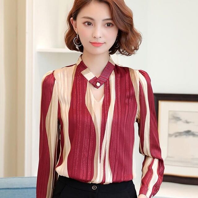 【送料無料】トップス シフォンシャツ ブラウス フォーマル オフィス 長袖 ノーカラー ストライプ 大きいサイズ 大人可愛い 上品 エレガント 30代 40代 50代 レッド ベージュ BY-151