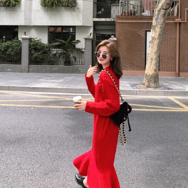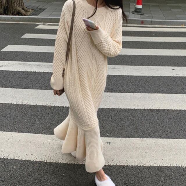 【送料無料】ニットワンピース ロング マキシ丈 大きいサイズ ケーブル編み マーメイド 長袖 フレア カジュアル 大人 上品 きれいめ 30代 40代 ホワイト レッド BY-159