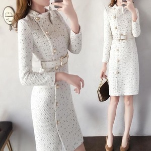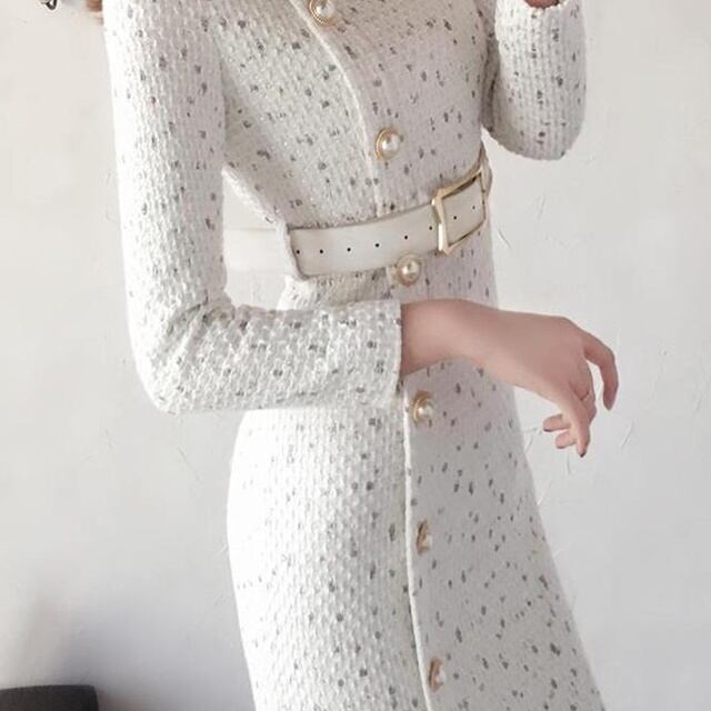 【送料無料】ワンピース 長袖 きれいめ ひざ丈 ツイード タイト リボン スリット ハイウエスト ベルト付き 上品 大人 フォーマル ホワイト 20代 30代 40代 BY-163