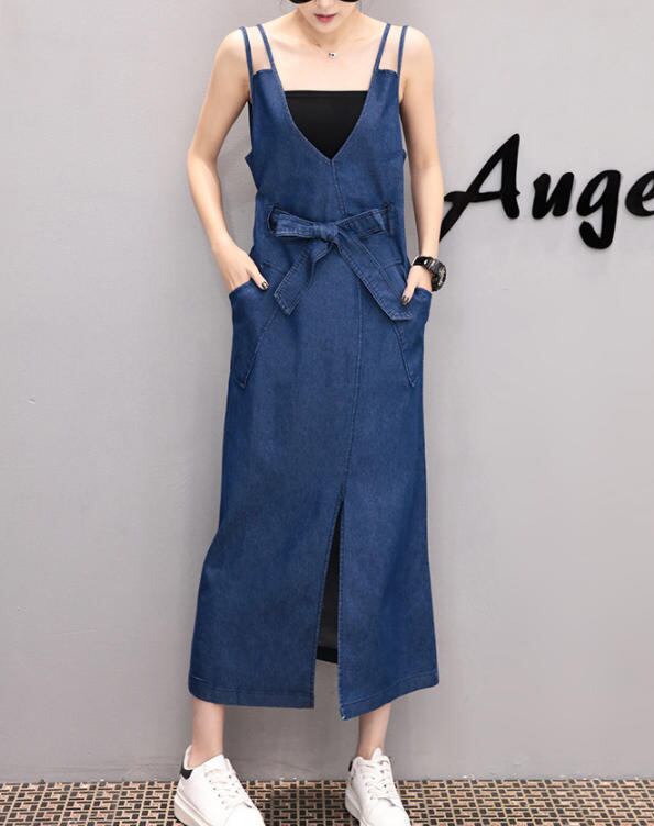 【送料無料】デニム ワンピース ジャンパースカート 大きいサイズ スリット ウエストリボン ゆったり カジュアル 大人 シンプル ベーシック 30代 40代 ブルー BY-226