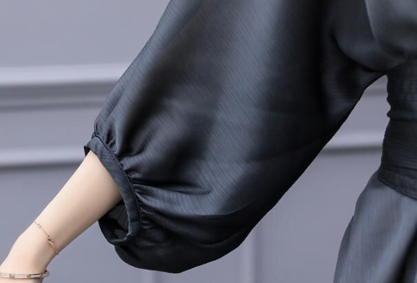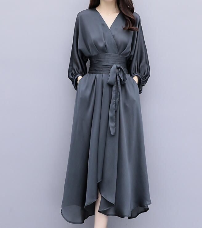 【送料無料】ワンピース 長袖 きれいめ カシュクール ロング丈 フレア ハイウエスト 上品 エレガント シック 大人 おしゃれ 通勤 フォーマル お呼ばれ 30代 40代 グレー BY-227