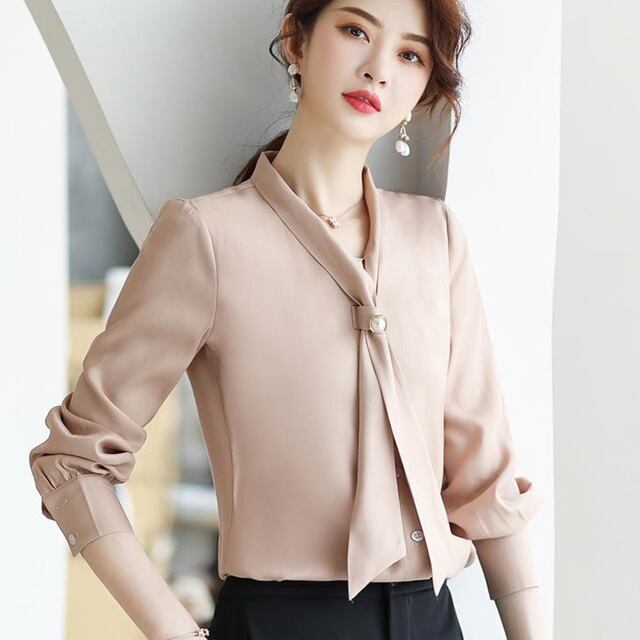 【送料無料】ブラウス フォーマル ボウタイ オフィス トップス 大きいサイズ パール 長袖 ゆったり 大人 上品 30代 40代 50代 ベージュ ホワイト ブルー BY-244