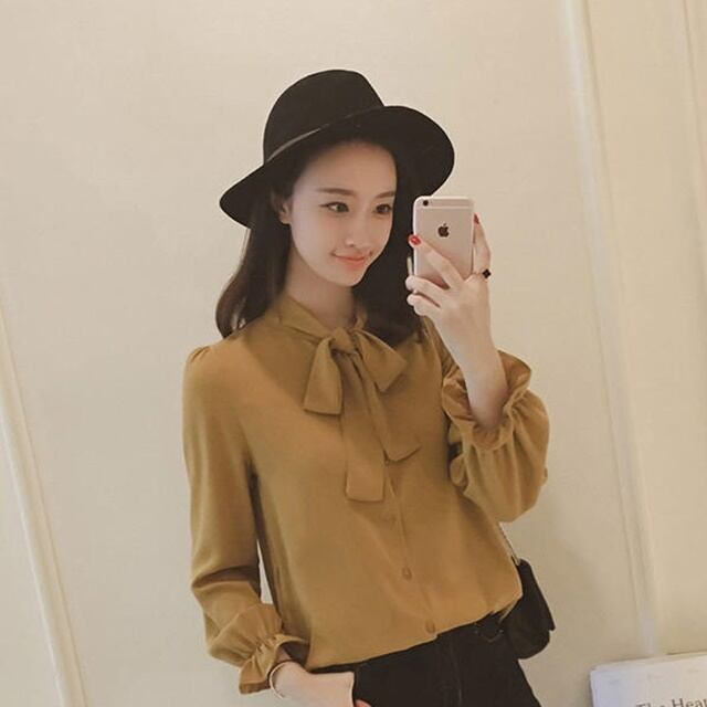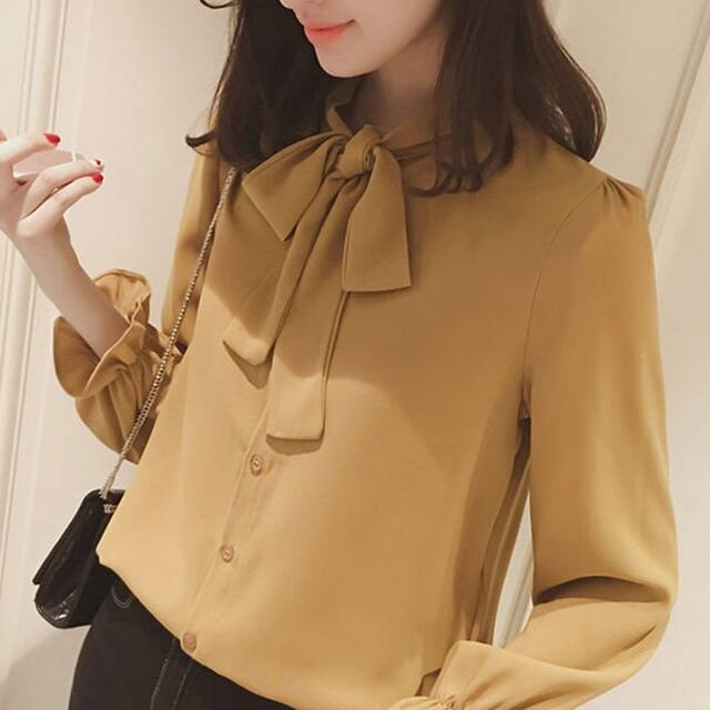 【送料無料】ブラウス フォーマル ボウタイ オフィス トップス 大きいサイズ リボンタイ 長袖 ゆったり 大人 レトロ 上品 30代 40代 50代 ホワイト ブラウン イエロー BY-245