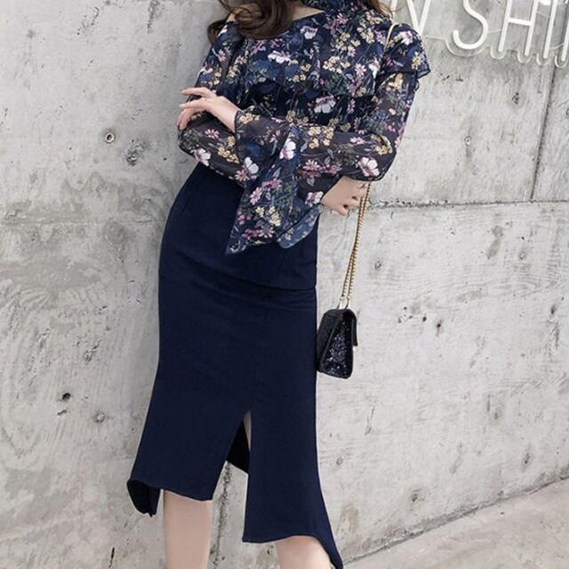 【送料無料】ブラウス フォーマル ボウタイ オフィス トップス 大きいサイズ ワンショルダー 花柄 シフォン 長袖 ゆったり 大人 上品 30代 40代 ネイビー BY-248
