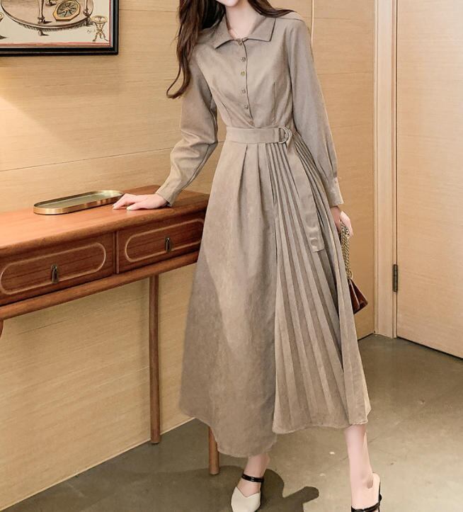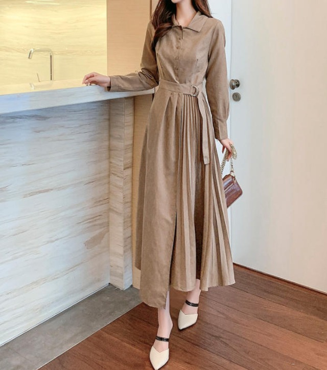 【送料無料】ワンピース 長袖 きれいめ フレア ロング丈 Aライン プリーツ切り替え ウエストベルト ゆったり 無地 シンプル フォーマル 通勤 オフィス 大人 上品 30代 40代 50代 ベージュ BY-261