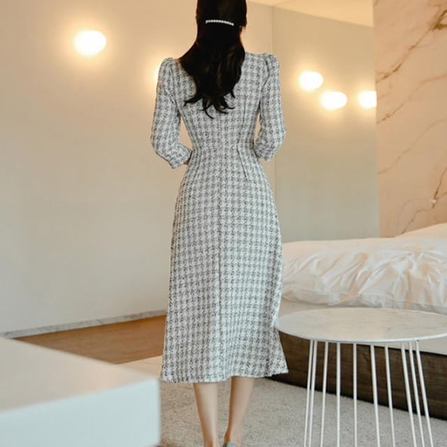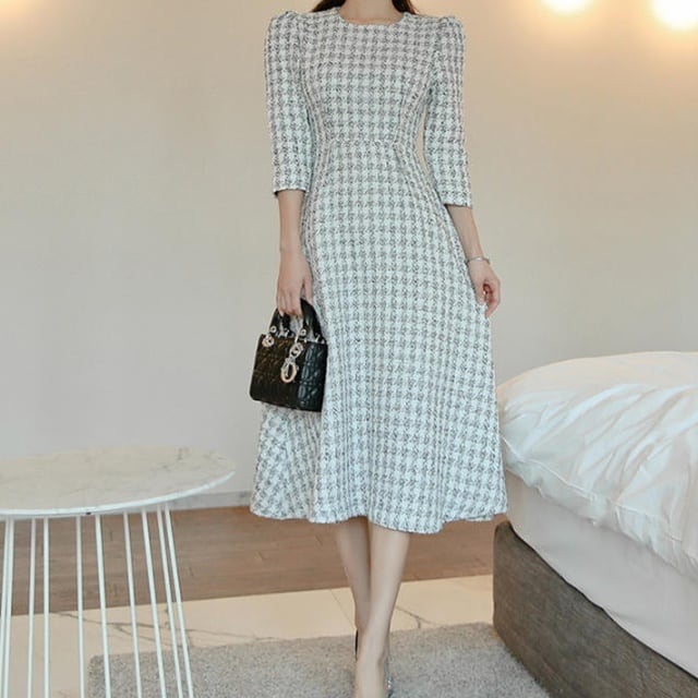 【送料無料】ワンピース 長袖 きれいめ 春 ロング ツイード Aライン フレア ハイウエスト 大人 エレガント 上品 お呼ばれ フォーマル 30代 40代 ホワイト BY-264