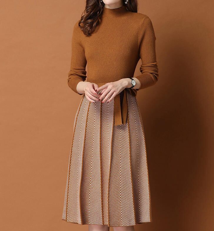 【送料無料】ワンピース 長袖 きれいめ 春 ひざ丈 プリーツ ハイウエスト ウエストリボン フレア Aライン 大人 おしゃれ エレガント 30代 40代 50代 ブラック ブルー ベージュ ブラウン BY-267