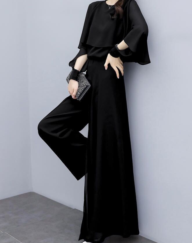 【送料無料】セットアップ おしゃれ ワイドパンツ ハイウエスト シフォン 五分袖 フリル 大きいサイズ きれいめ エレガント 上品 お呼ばれ パーティー 30代 40代 ブルー ブラック BY-288
