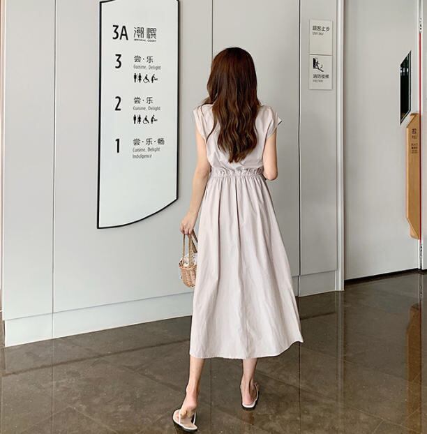 【送料無料】ワンピ―ス きれいめ 春夏 ロング ハイウエスト フレンチスリーブ Aライン フレア 大人 上品 きれいめ シンプル ベーシック カジュアル 30代 40代 50代 ベージュ BY-297