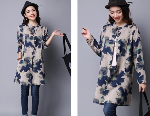 【送料無料】シャツ ブラウス ロングシャツ 麻 リネン トップス 花柄 ノーカラー ゆったり レトロ カジュアル おしゃれ 大人 上品 30代 40代 ブルー ピンク BY-310