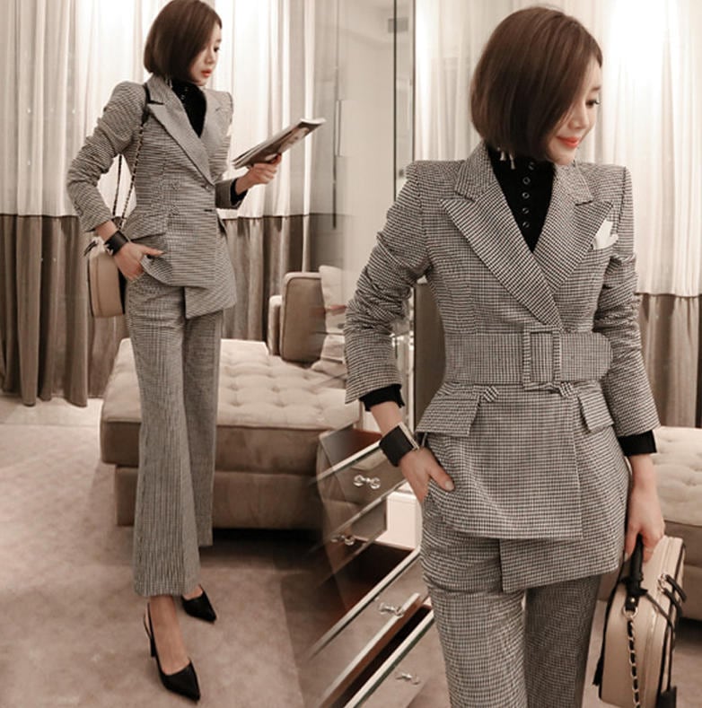 【送料無料】セットアップ おしゃれ パンツスーツ 卒園式 大きいサイズ 卒業式 結婚式 千鳥格子 ウエストベルト きれいめ フォーマル 上品 大人 シンプル 30代 40代 50代 グレー BY-346