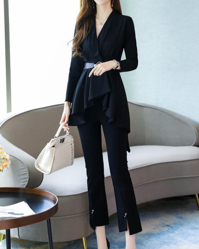 【送料無料】セットアップ おしゃれ パンツスーツ 卒園式 大きいサイズ 卒業式 結婚式 ロングパンツ ハイウエスト アシンメトリー フリル きれいめ フォーマル 上品 大人 シンプル 30代 40代 50代 ブラック BY-370