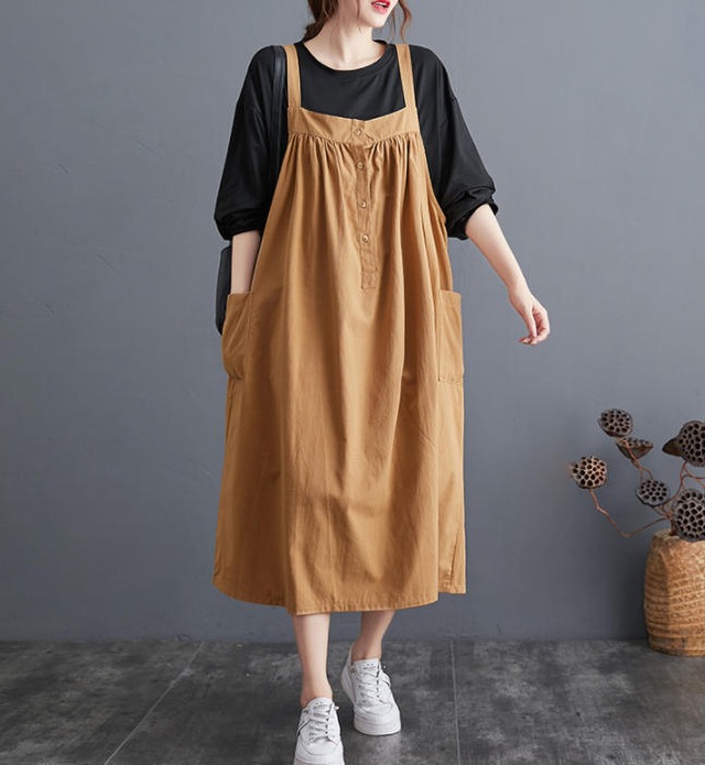 【送料無料】ジャンパースカート ロング ゆったり フレア 体型カバー 無地 ナチュラル 可愛い おしゃれ ベーシック 大人 カジュアル シンプル 30代 40代 50代 ベージュ ブラック OP-010R
