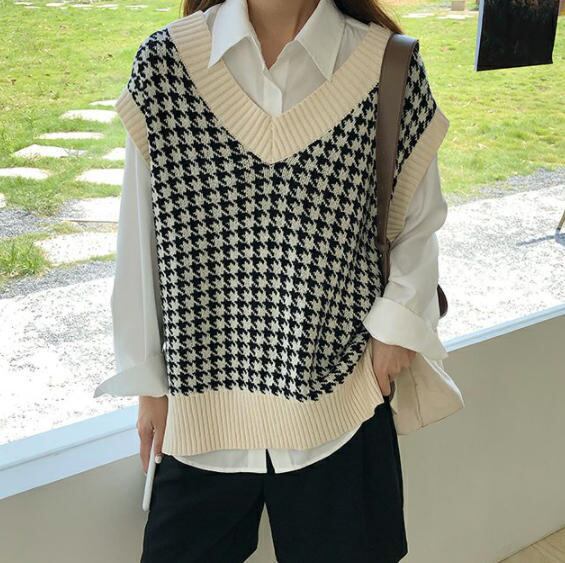 【送料無料】ニットベスト トップス 千鳥格子 Vネック ノースリーブ きれいめ ゆったり カジュアル おしゃれ レトロ 大人 30代 40代 ブラック TP-009R