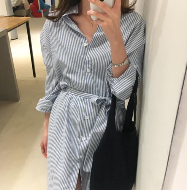 ウエストリボンでメリハリをつけたシャツワンピース♪