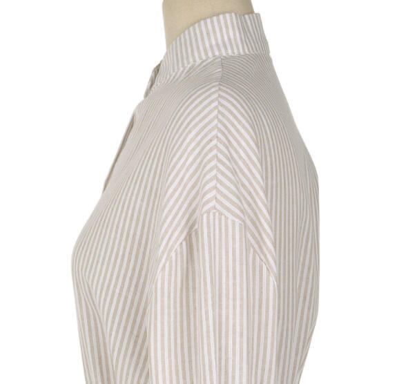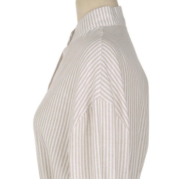 【送料無料】シャツワンピ―ス 春 ロング 長袖 ストライプ ノーカラー ウエストリボン 体型カバー ゆったり 大人 きれいめ カジュアル ベーシック シンプル 30代 40代 ブルー ベージュ OP-026R
