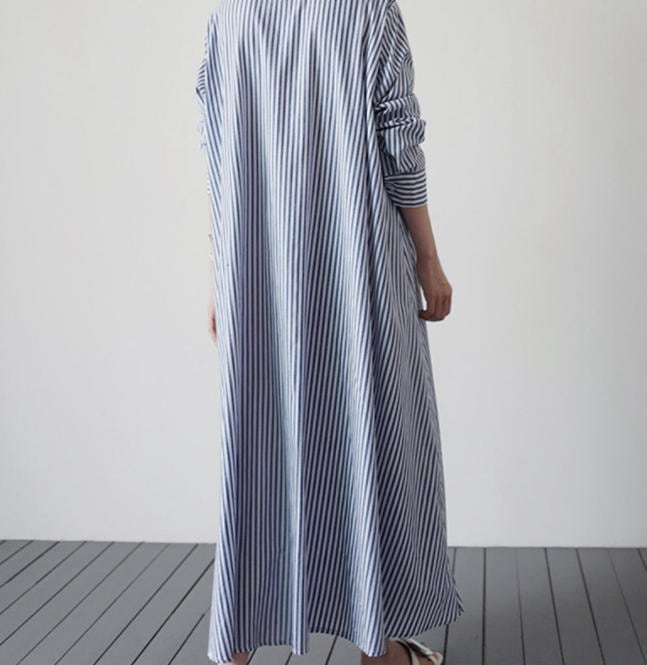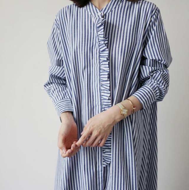 【送料無料】シャツワンピ―ス 春 ロング 長袖 ストライプ フリル ルーズ 体型カバー ゆったり 大人 きれいめ カジュアル ベーシック シンプル 30代 40代 ブルー レッド OP-035R